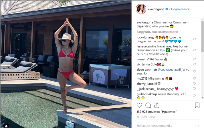 44-летняя актриса Ева Лонгория проводит отпуск вместе с мужем, 51-летним бизнесменом Хосе Антонио Бастоном, и сыном Сантьяго на Карибах. Звездная семья остановилась на вилле в Сен-Бартелеми. Актриса опубликовала в Instagram снимок, на котором она позирует у бассейна в красном бикини от Melissa Odabash. Она завершила образ большой соломенной шляпой и черными солнцезащитными очками.