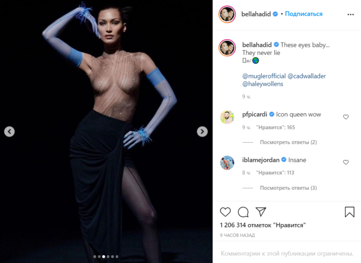 На размещенном в сети снимке 25-летняя знаменитость позирует на темном фоне. На ней — прозрачный сверкающий топ с короткими рукавами, полностью обнажающий ее грудь, черная юбка длины миди и капроновые колготки со стрелками. Образ Хадид дополнили туфли на каблуках с острым носом и длинные ярко-синие перчатки до плеч.