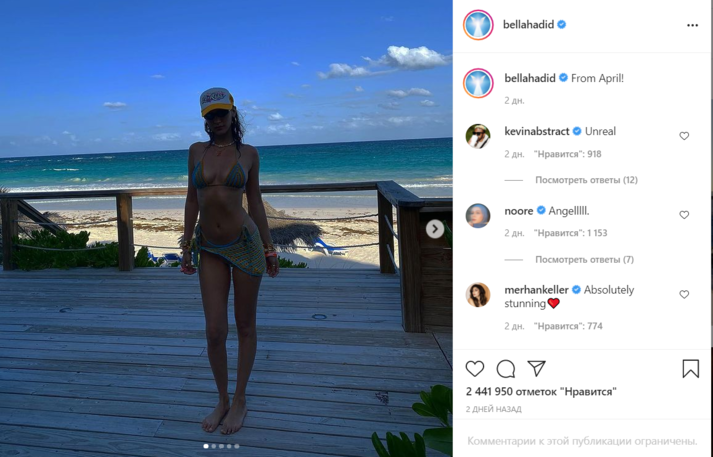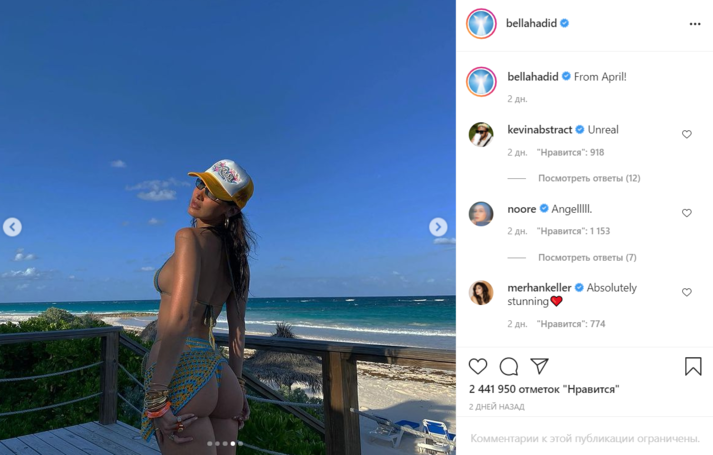 Супермодель палестинско-голландского происхождения Белла Хадид снялась в бикини во время отдыха и взволновала поклонников. Соответствующая серия снимков появилась на ее странице в Instagram.