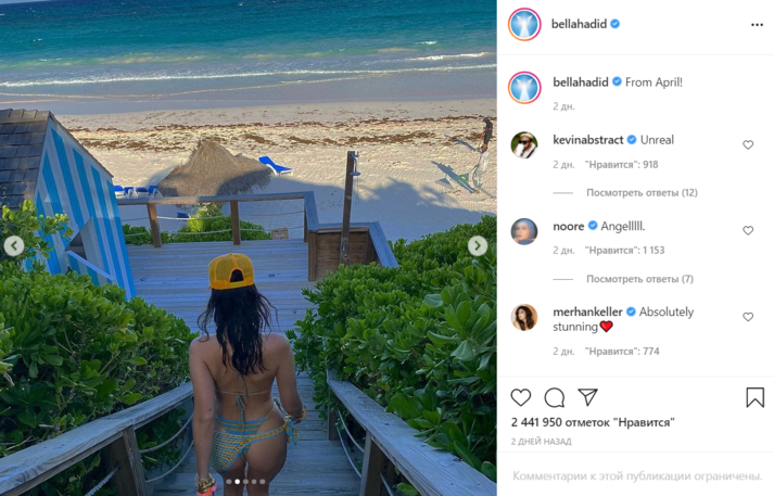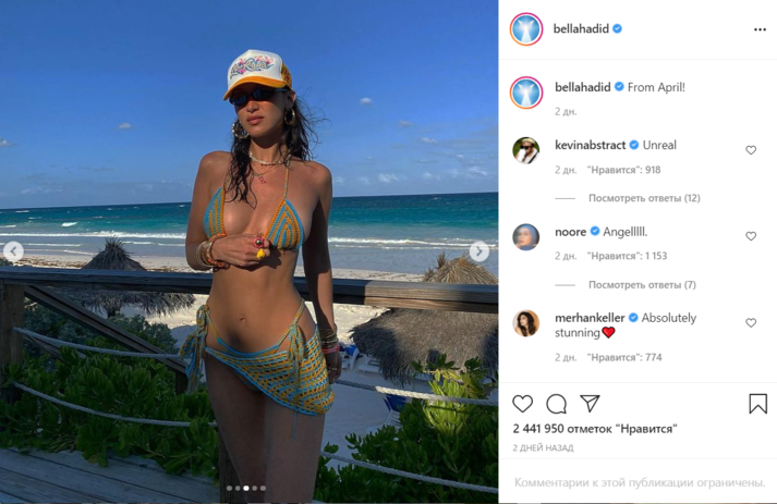 На размещенных в сети кадрах 24-летняя знаменитость позирует на пляже, на фоне моря. На ней — раздельный вязаный купальник в оранжево-голубую полоску и парео с таким же принтом. Образ модели дополнили желто-белая кепка, крупные серьги, колье, браслеты и кольца. Публикация набрала 2,4 миллиона лайков.