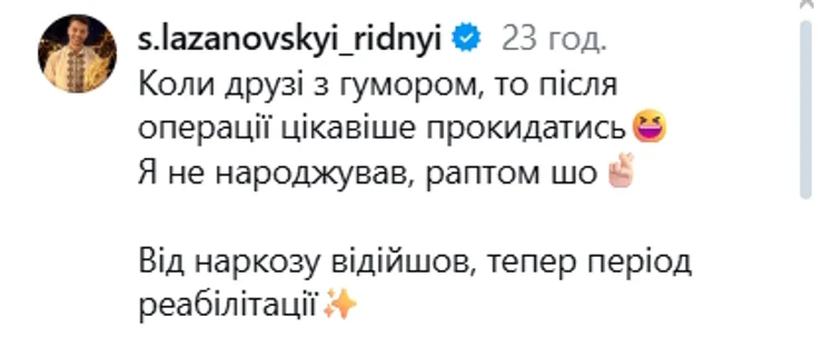 «Мене ще нудить трохи від наркозу, то не можу всім відповісти, але всіх обіймаю. Зі мною все добре. Операція була планова, треба було її зробити в період, коли хоч трохи вихідний», – написав артист у своїх сторіз.