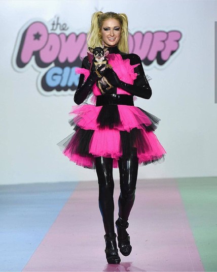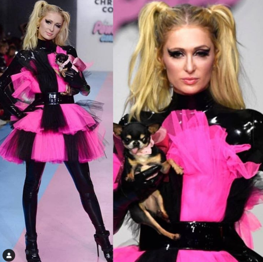 На подиуме «блондинка в шоколаде» блистала в латексных ботфортах и черно-розовом платье. Игра контрастов в наряде звезды получилась очень эффектной. Пэрис взяла на руки маленькую собачку, чтобы еще больше влиться в образ «крутой девчонки». Яркий макияж с насыщенными черными стрелками идеально вписался в общую концепцию.