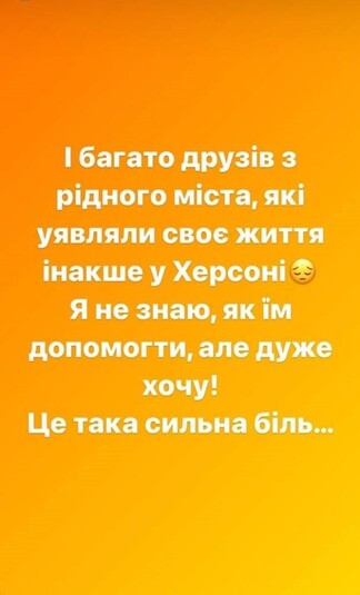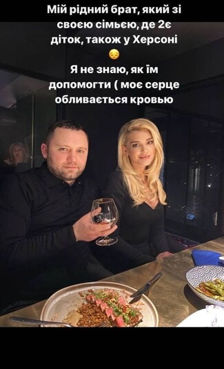 «Немножко откровенности. Мой отец находится в оккупированном городе Херсоне, уехать он не может, потому что машины расстреливают. Мой родной брат, который с семьей, где есть двое детей, тоже в Херсоне. Я не знаю, как им помочь (мое сердце обливается кровью)», – поделилась артистка.