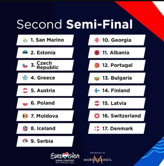 Во втором полуфинале, который состоится 20 мая, на сцене выступит 17 стран-участниц, в том числе Сан-Марино, Эстония, Чехия, Греция, Австрия, Польша, Молдова, Исландия, Сербия, Грузия, Албания, Португалия, Болгария, Финляндия, Латвия Швейцария, Дания.