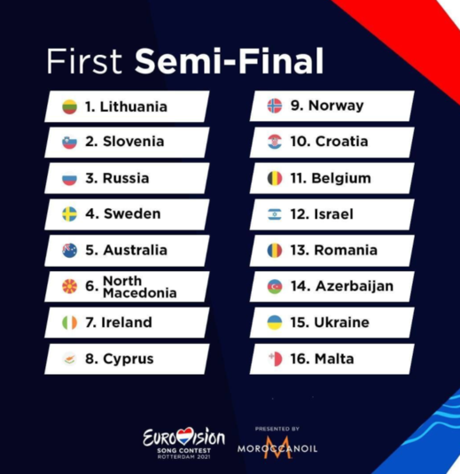 Так, кроме Украины 18 мая в Роттердаме выступит Литва, Словения, Россия, Швеция, Австралия, Северная Македония, Ирландия, Кипр, Норвегия, Хорватия, Бельгия, Израиль, Румыния, Азербайджан, Украина, Мальта.