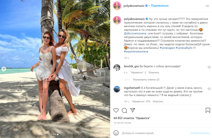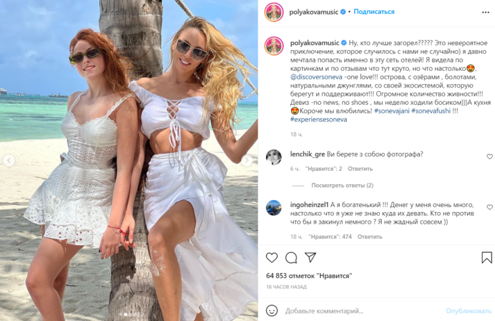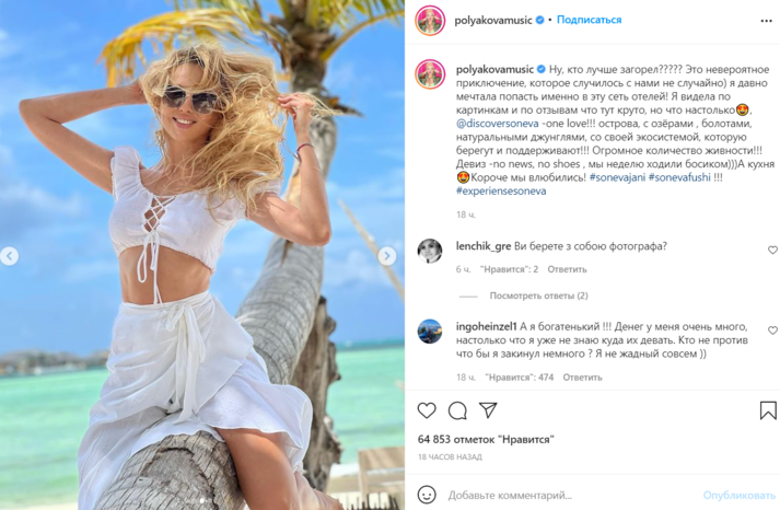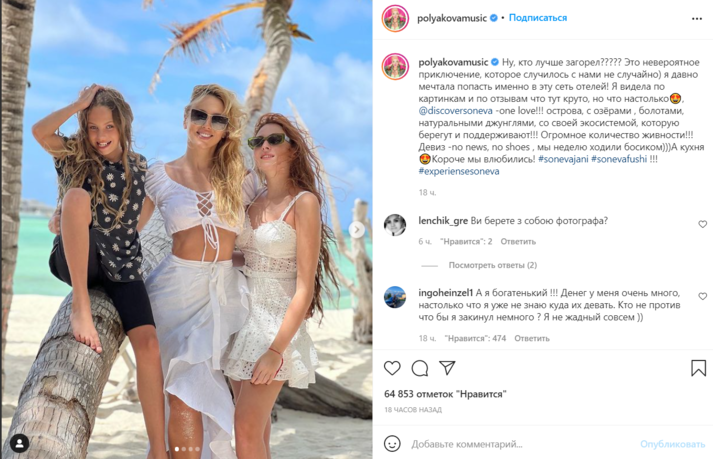 «Это невероятное приключение, которое случилось с нами не случайно. Я давно мечтала попасть именно в эту сеть отелей! Я видела на картинках и по отзывам, что здесь круто, но что настолько! Острова с озерами, болотами, натуральными джунглями, со своей экосистемой, которую берегут и поддерживают! Огромное количество живности! Девиз - no news, no shoes, мы неделю ходили босиком! А кухня… Короче мы влюбились!» – поделилась артистка.