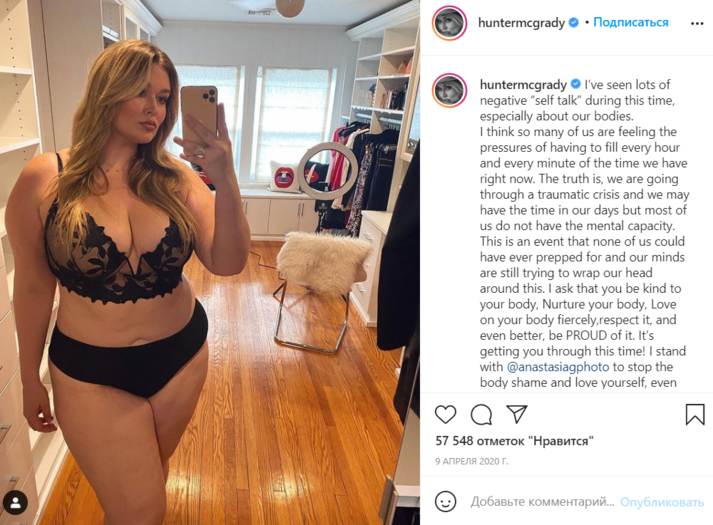 При этом знаменитость отмечает, что у нее бывают дни, когда она недовольна своей фигурой: в такие моменты Макгрэйд хочет остаться дома вместо того, чтобы работать и выполнять обязанности. «Такие дни — это нормально, не следует их стыдиться», — подчеркивает она.