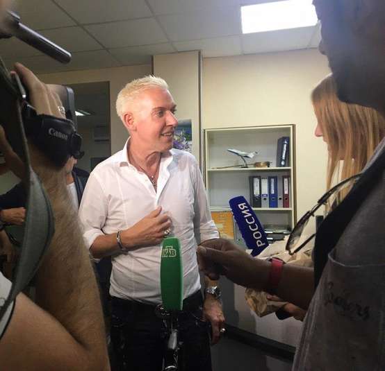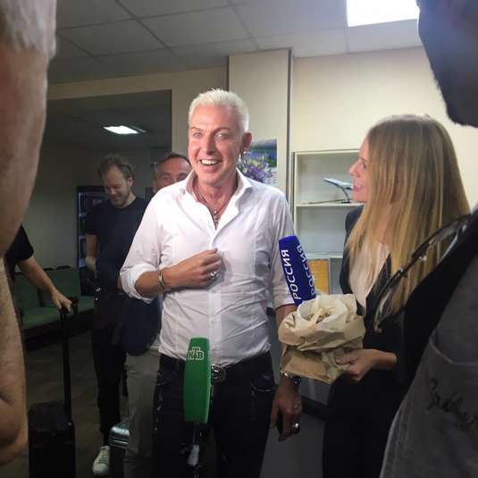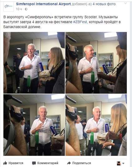 О том, что группа уже прибыла в оккупированный Крым, сообщили на официальной странице Международного аэропорта «Симферополь» в Facebook и опубликовали фотографии лидера Scooter — Эйч Пи Бакстера в окружении журналистов.