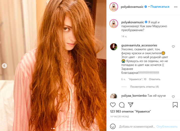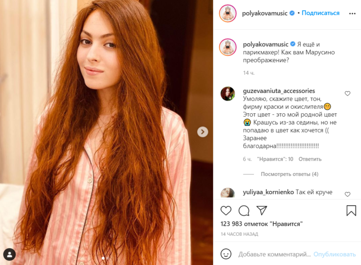 На своей странице в Instagram артистка опубликовала фотографии, на которых Маша позирует с ярко-рыжим цветом волос.