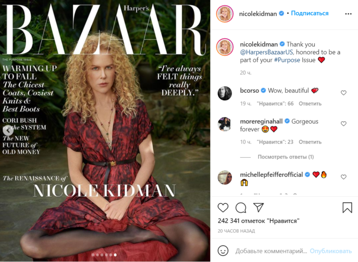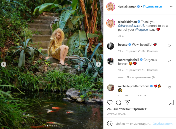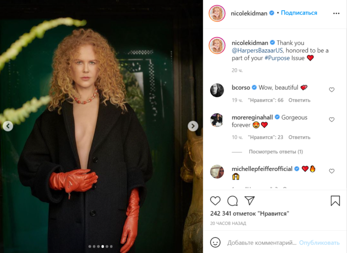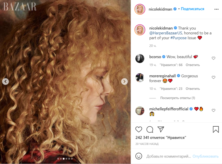 Публикация Кидман набрала 220 тысяч лайков. Поклонники оценили внешний вид актрисы в комментариях. «Вау, красиво!», «Боже, в каком году были сделаны эти снимки? Ты неподвластна времени!», «Влюблена в твои естественные кудри!», «Потрясающая Николь», «Самая красивая женщина на планете!» — высказывались фанаты.