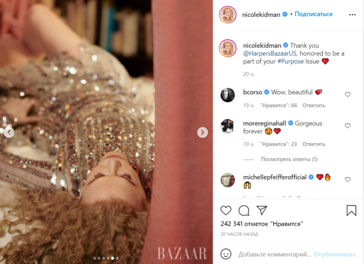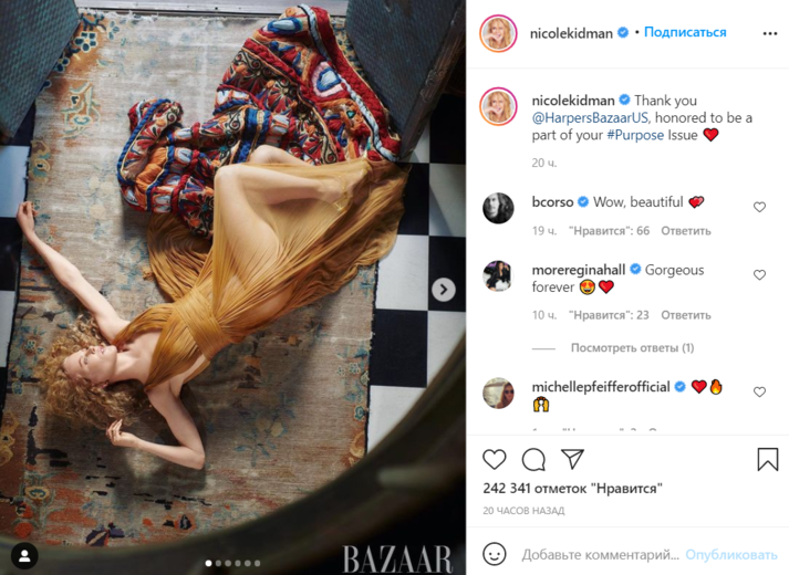 Голливудская актриса Николь Кидман приняла участие в откровенной фотосессии для обложки модного журнала Harper's Bazaar. Соответствующие кадры появились на ее странице в Instagram.