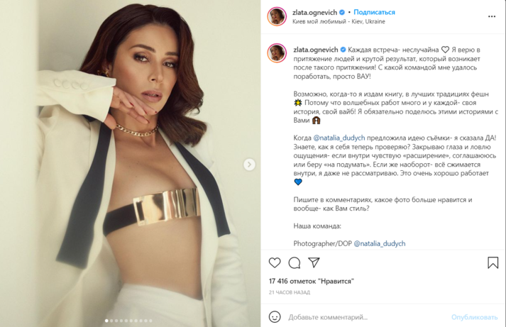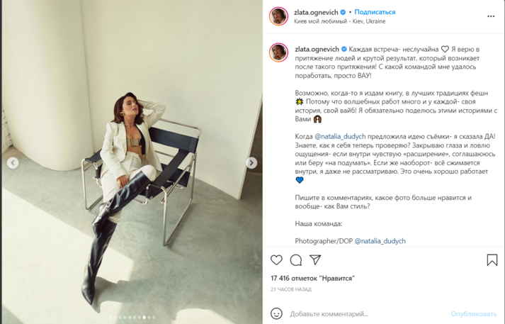 Артистка поделилась с поклонниками кадрами, на которых предстала в необычном и одновременно довольно смелом образе. Во время недавней фотосессии в объективе фотографии Natalia Dudych Злата позировала в белом костюме и черных сапожках.