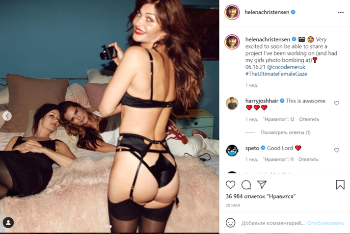 Модель позировала в откровенном черном комплекте, который подчеркивал ее стройную фигуру. Полуобнаженные ягодицы, вырезы в пикантных местах, обвивающие тело ленты — Хелена предстала в виде роковой женщины и дополнила свой обезоруживающий образ чулками, поясом и контрастной красной помадой. А компанию брюнетке составили ее подруги — дизайнер Камилла Стерк и звезда «Голубой лагуны» Брук Шилдс.