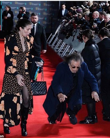 В Лондон Аль Пачино прилетел вместе со своей возлюбленной, 40-летней израильской актрисой Мейталь Дохан. Поднимаясь по ступенькам знаменитого Royal Albert Hall, легендарный актер запнулся о красную ковровую дорожку и не смог устоять на ногах. К нему на помощь поспешили его спутница и охрана. Благодаря им актеру удалось подняться и он отправился в зал.