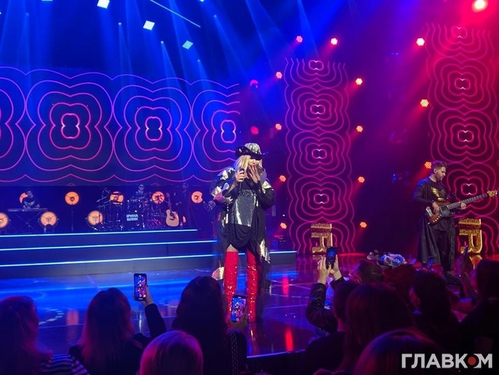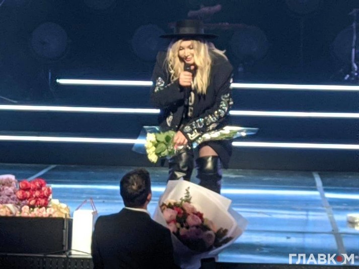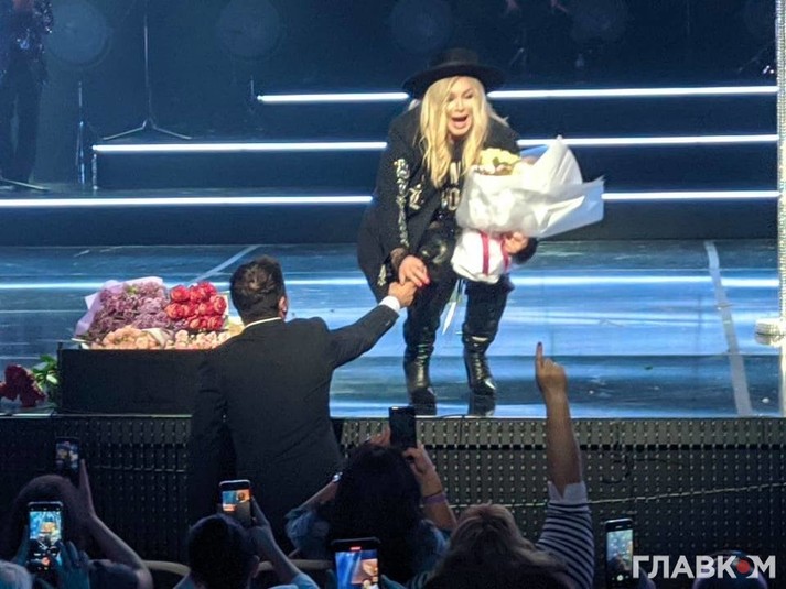 Во время исполнения хита «Ты мой» Владимир Зеленский прошел к сцене и вручил Примадонне украинской эстрады большой букет