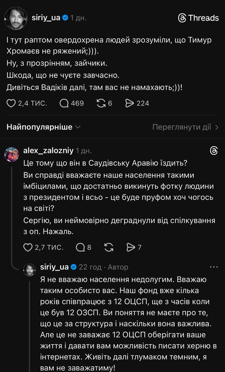 Сергій Притула висловився про службу Тимура Хромаєва. Також волонтер згадав у своєму дописі про нещодавнє інтерв’ю чоловіка співачки Олі Полякової – бізнесмена Вадима Буряковського, який назвав Хромаєва «мажором».
