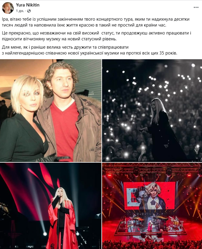 Продюсер Юрій Нікітін публічно звернувся до української співачки Ірини Білик, привітавши її з завершенням концертного туру. У дописі на своїй Facebook-сторінці він назвав артистку «найлегендарнішою співачкою нової української музики», передає «Главком».
