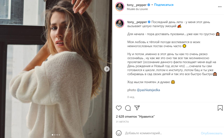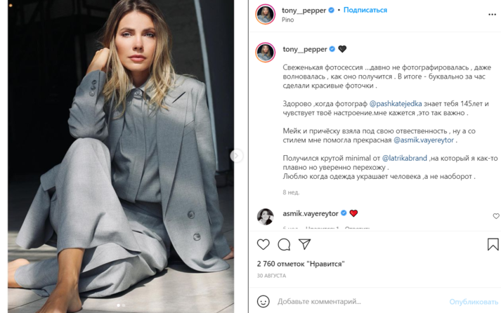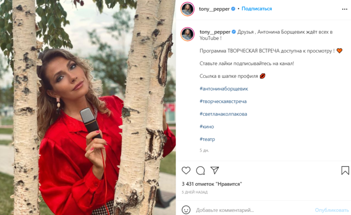 Так, недавно Антонина Паперная сообщила, что запустила в YouTube новый проект, суть которого - творческие встречи и интервью с известными деятелями культуры, стилизованные под телевизионные программы прошлого столетия. В кадре молодая актриса появляется в образе, очень напоминающий стиль 80-х годов. Для программы Тоня так же придумала себе псевдоним – теперь она Антонина Борщевик.