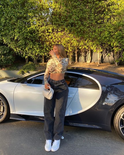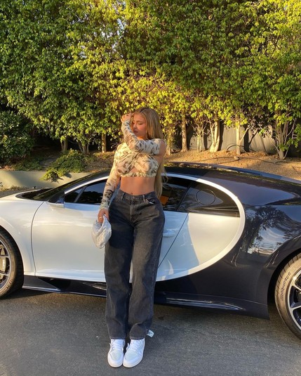 23-летняя знаменитость попозировала в бежево-черном топе с вырезом под грудью, черных джинсах свободного кроя и белых кроссовках. Ее образ дополнил небольшой клатч молочного цвета. На снимке Дженнер опирается на собственный черно-белый Bugatti Chiron стоимостью три миллиона долларов. Публикация набрала больше 4,5 миллиона лайков.