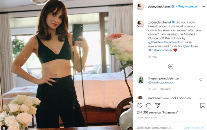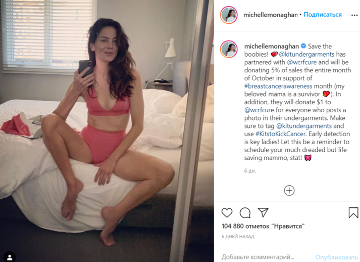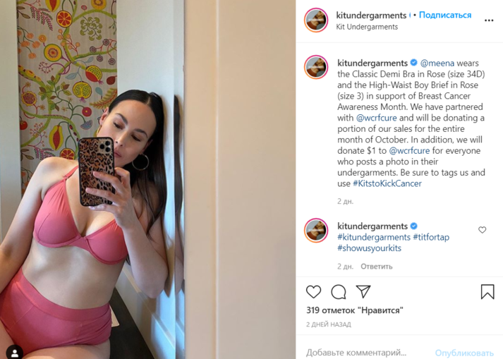 Звезды снимались в комплекте Kit Undergarments в рамках запущенной маркой акции. Согласно ее условиям, калифорнийский онкологический центр Women’s Cancer Research Foundation будет получать от компании по одному доллару за каждый опубликованный в соцсетях пост с хештегом #kitstokickcancer. Кроме того, в фонд будут также направлены пять процентов от всех продаж компании за октябрь.