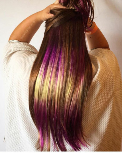 Основная идея тенденции в том, что, вместо того, чтобы смешивать красители, чтобы создать эффект радуги Ombre, волосы отбеливают по горизонтали или по вертикали, чтобы создать линию блеска.