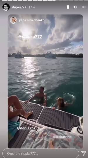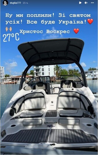 В сторис своей страницы в соцсети Ступка разместил фото вчерашнего отдыха на яхте. «Ну, мы поплыли! С праздником всех! Все будет Украина! Христос воскрес!» – написал он. Ступка указал локацию – Майами-Бич, штат Флорида. На одном из фото – ступни спутницы, находящейся на яхте рядом.