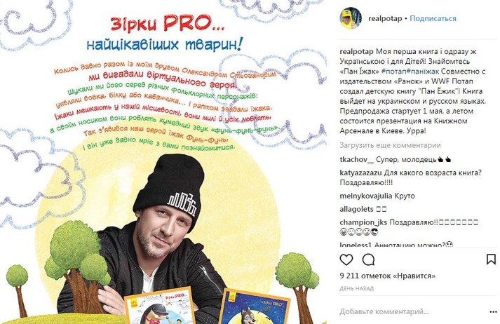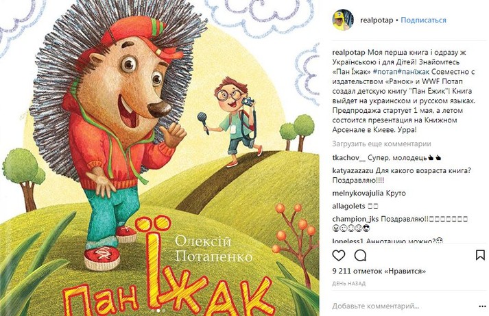 «Моя первая книга и сразу же на украинском и для детей! Знакомьтесь, – «Пан Їжак», - написал Потап в соцсети и отметил, что презентация пройдет уже этим летом.