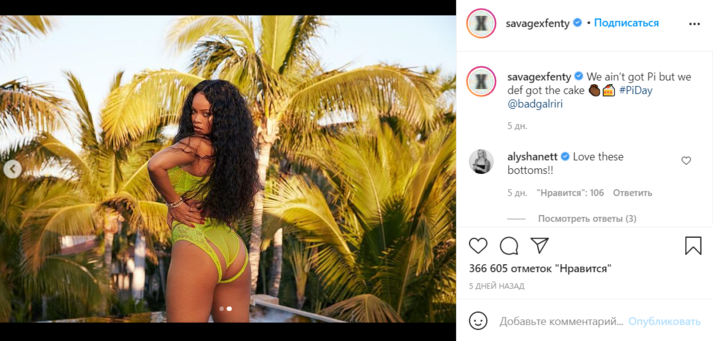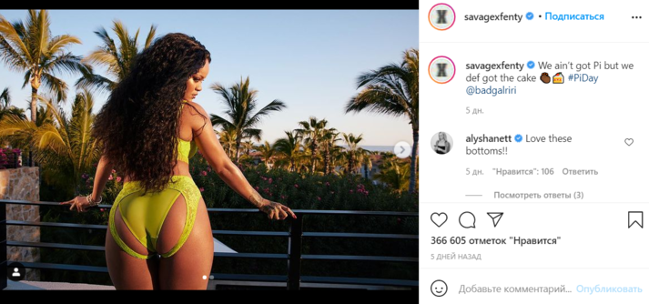 33-летняя исполнительница хита Umbrella снялась в белье собственного бренда Savage x Fenty, в инстаграме которого и появились жаркие снимки. Певица позировала в ажурном комплекте салатового цвета, который весьма необычно подчеркивал ее пышные формы. Артистка решила сделать акцент на ягодицах и не прогадала.
