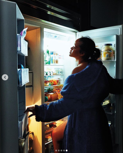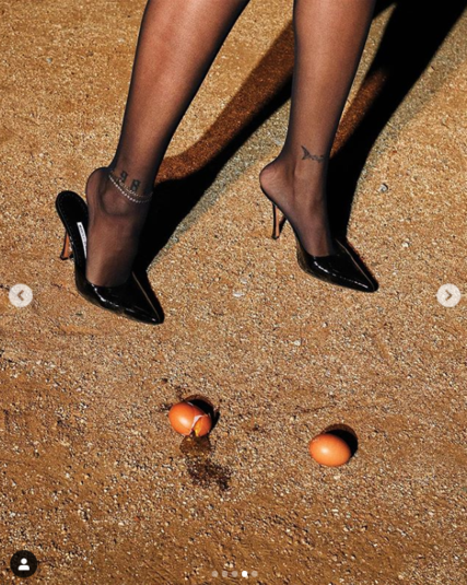 Певица попозировала во дворе дома в нижнем белье собственного бренда Savage X Fenty и комбинезоне Chanel белого цвета. Ее также сфотографировали в футболке, черных колготках и розовых босоножках на каблуках с мусорными пакетами в руках. На другом фото звезда вкручивает лампочку, стоя на лестнице в том же наряде.