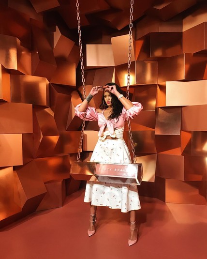 Популярная американская певица Рианна появилась в костюме от украинского дизайнера Marianna Senchina. Это платье-комбинация относится к линии весенней одежды следующего года. В столь сексапильном наряде она представила в Мадриде собственную линию косметики Fenty Beauty.