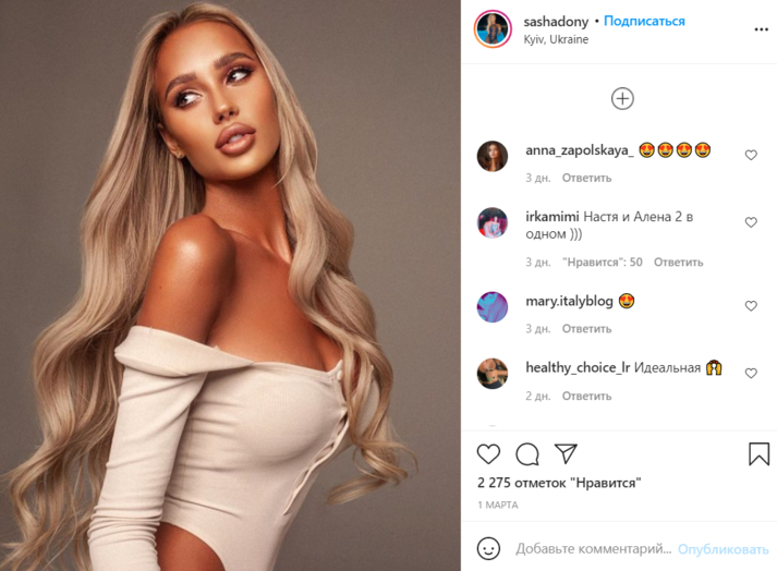 На своей странице в Instagram украинка часто демонстрирует подтянутые формы, хорошую растяжку и умение садиться на шпагат. Также девушка любит путешествовать и показывает подписчикам снимки с отдыха на яхтах и различных курортах.