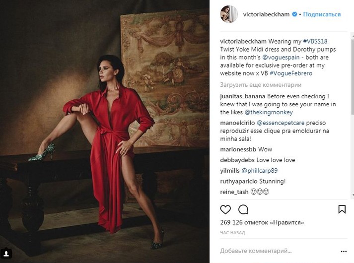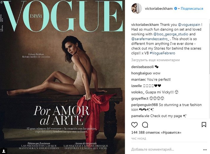 Виктория Бекхэм стала главной героиней нового номера Vogue Spain. Певица и дизайнер опубликовала несколько кадров из фотосета для популярного издания в своем Instagram.