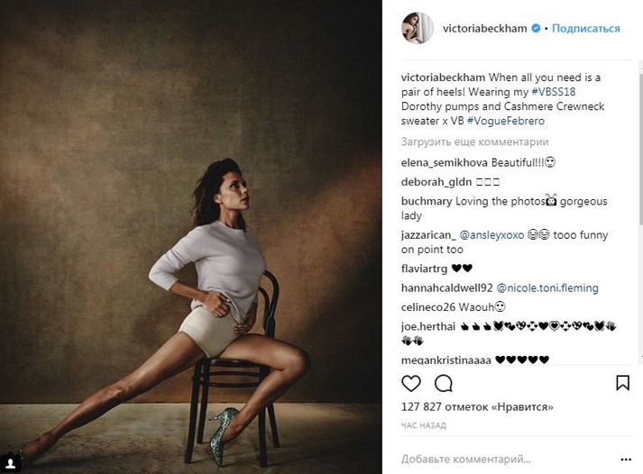 На одном из снимков Виктория позирует в алом платье с сексуальным разрезом и демонстрирует свои стройные ноги. А на другом, фотограф снял супругу популярного футболиста Дэвида Бекхэма на стуле в боди и в свитшоте.
