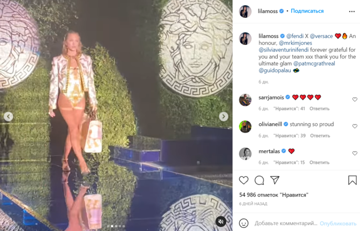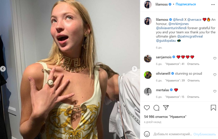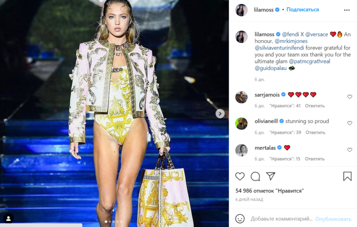 18-летняя Лила Грэйс Мосс прошлась по подиуму на совместном шоу люксовых брендов Fendi и Versace. Папарацци засняли манекенщицу в боди со скрепкой в области декольте, которое украшено орнаментом золотого цвета. На ней также — укороченный пиджак, колье в виде логотипа Fendi и туфли на каблуках. В руках девушка держит большую сумку.
