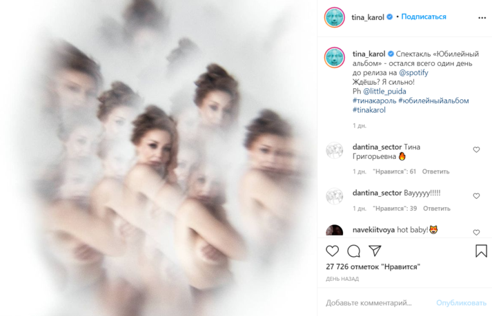 В своем Инстаграме звезда разместила дерзкую фотографию, на которой позирует топлес. Обнаженную грудь исполнительница игриво прикрывает руками. Автором откровенного фото Тины стала фотограф Анна Гончарова.