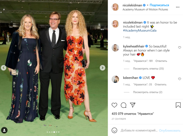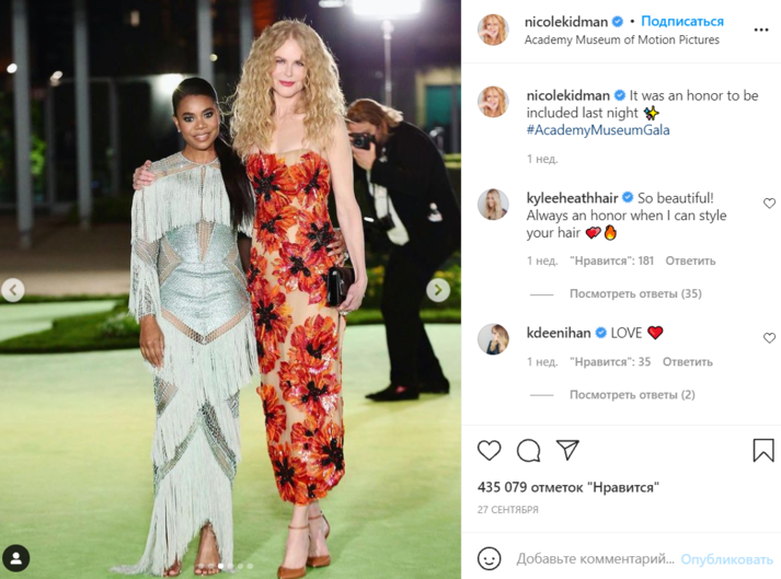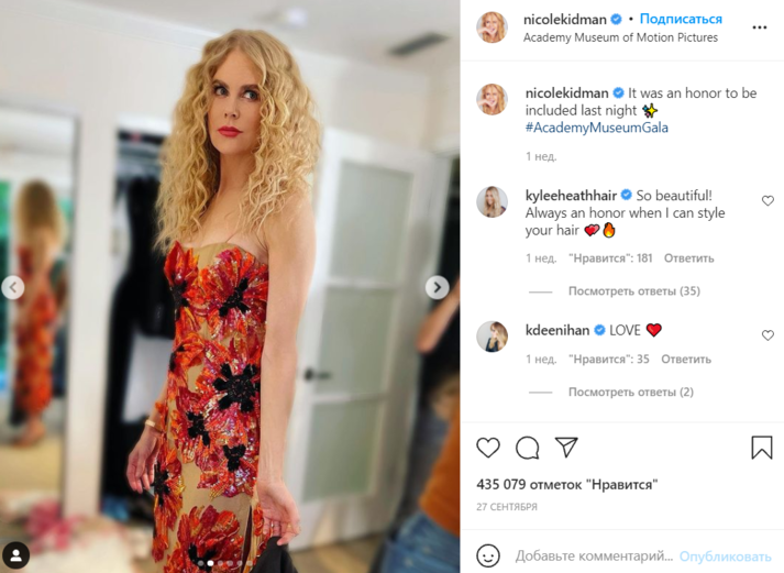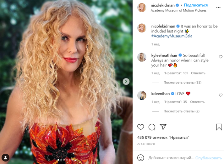 Но изюминкой образа стала прическа, которую обожают миллионы. Николь Кидман распустила свои золотистые мелко вьющиеся волосы, разделив их на прямой пробор. Лук актрисы произвел фурор. Фанаты сразу вспомнили ее первые фильмы, сделавшие актрису легендой. С мнением публики полностью согласны стилисты. Популярный эксперт в мире моды Любовь Фасхутинова объяснила, почему прическа звезды имела такой эффект.
