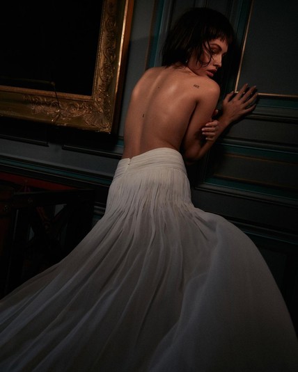 Так, в начале года Тилан опубликовала кадры из фотосессии, на которой она запечатлена в белоснежной юбке в пол. Обнаженную грудь модель прикрывает руками. Дополнил образ короткий черный парик.