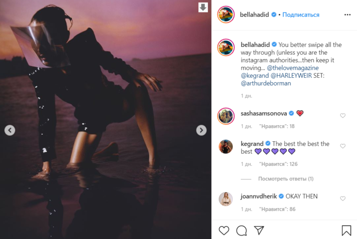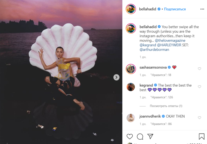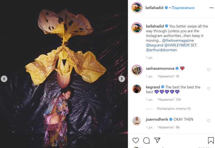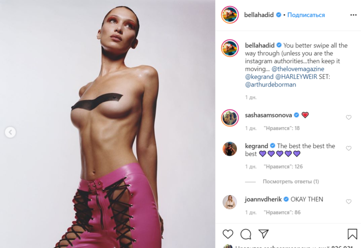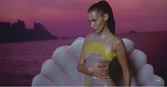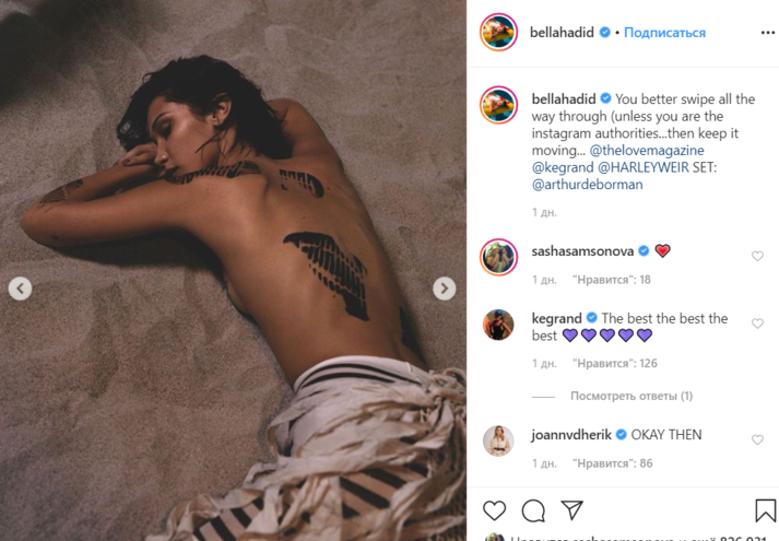 23-летняя американская модель Белла Хадид стала лицом новой обложки журнала Love Magazine. По замыслу наследница палестинского миллиардера воплотила перед камерой несколько смелых образов. Так, Белла топлес позировала на песке, демонстрируя на спине необычные татуировки, нарисованные гуашью. Звезда распустила влажные волосы и была с минимальным макияжем.