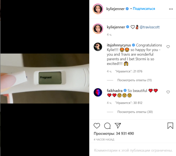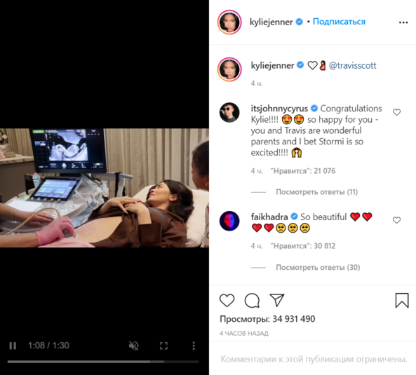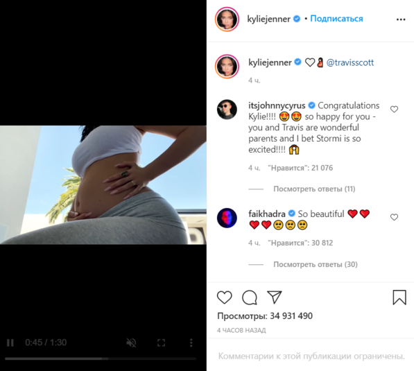24-летняя инстадива Кайли Дженнер решила сообщить о беременности с помощью трогательного видео. В нем звезда показала, как рассказала о радостном событии возлюбленному и матери. Также она поделилась первыми кадрами с округлившимся животом и уникальными фрагментами с семейных торжеств.