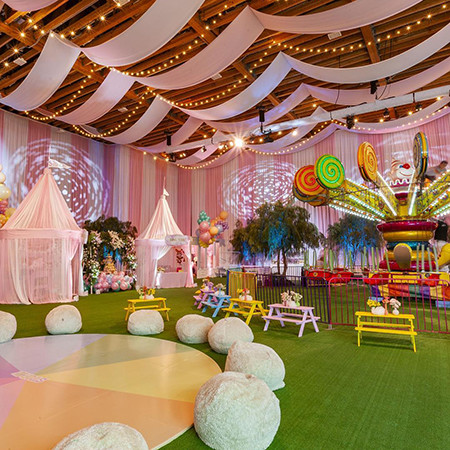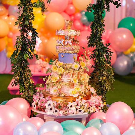 Декор для торжества был выбран весьма неожиданный: к примеру, пройти в шатер всем гостям предлагалось прямо через рот огромной надувной головы (копией головы самой малышки Сторми). Проходя сквозь необычные «врата», гости оказывались в настоящей сказке: помещение было декорировано действующими аттракционами, воздушными шарами и гигантскими плюшевыми медведями. Потолок шатра был затянут фотообоями с изображением голубого неба с воздушными, как вата, облаками.