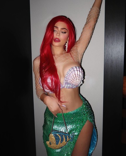 22-летняя Кайли Дженнер один за другим демонстрирует свои образы на Хэллоин. На этот раз она остановила выбор на русалочке Ариэль из мультфильма компании Disney. Звезда Она надела лиф-сетку из ракушек с жемчугом, который подчеркнул ее пышную грудь. Рыбий хвост Кайли заменила изумрудная юбка с откровенным разрезом, украшенная стразами.
