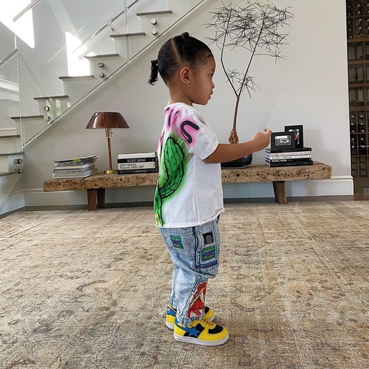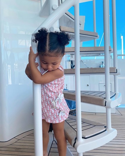 Свою наследницу Дженнер нарядила в короткое платье, а ее вьющиеся волосы собрала в два забавных хвостика. Образ малышки дополнили сандалии на полупрозрачных ремешках в тон одежды. Девочка позировала у мамы на руках, глядя прямо в камеру с серьезным выражением лица. Кажется, Сторми уже готова быть моделью!