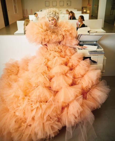 Основательница бренда Kylie Cosmetics также примерила пышное платье персикового цвета. Кайли приняла изящную позу, изображая, что занята офисными делами. Одним из самых гламурных аутфитов Дженнер стало розовое платье с воланами и сексуальным разрезом. Представительницу семейства Кардашьян с собачкой на коленях запечатлели во время разговора по телефону.