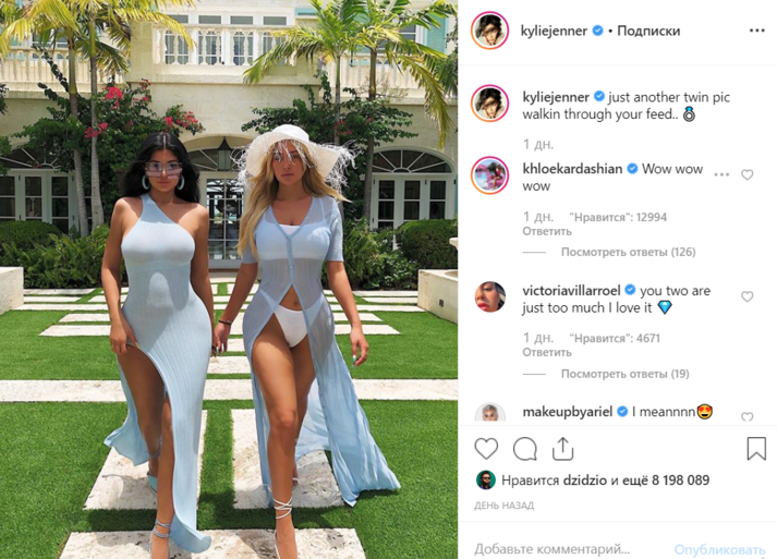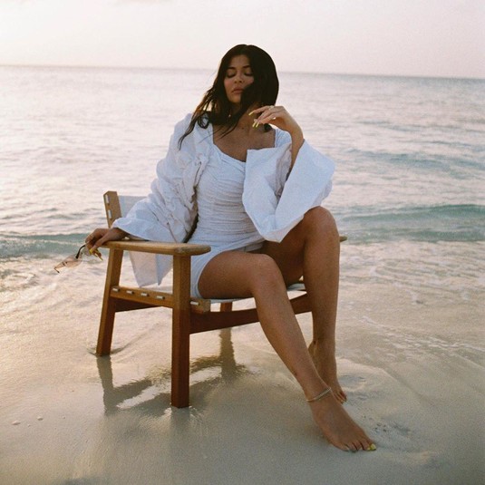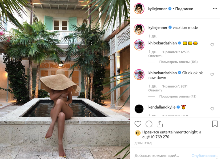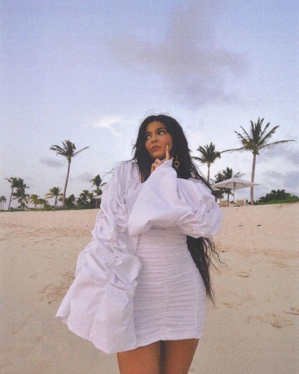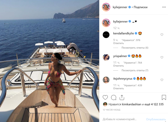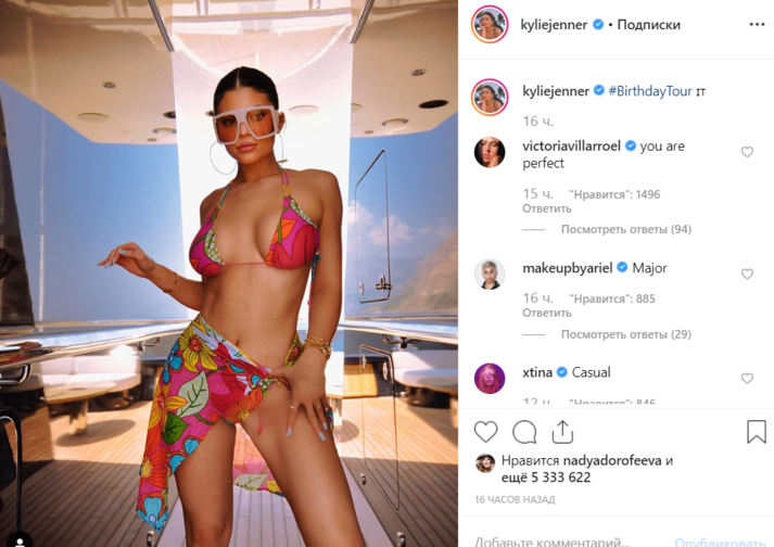 «Отпускной» снимок Кайли появился после того, как она выложила фото своего частного джета, названного ее именем. На борту самолета она устроила девичник в честь запуска своей новой линейки средств по уходу за телом.