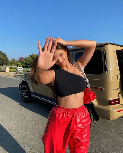 Младшая сестра Ким Кардашьян облачилась в облегающий комбинезон из трикотажной ткани с дырками. Под него самая юная миллиардерша в мире надела контрастное бра-бандо и высокие трусики. Наряд подчеркнул тонкую талию знаменитости и ее округлые бедра. Кайли игриво позировала, снимая себя в отражении зеркала. Звезда положила руку на голову.