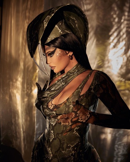 23-летняя знаменитость снялась в облегающем наряде со змеиным принтом. Она попозировала в боди с глубоким декольте, легинсах, длинных перчатках и прозрачной обуви. Головной убор Дженнер выполнен в виде морды кобры с двумя клыками. На лицо звезды нанесен яркий макияж в стиле smoky eyes и рисунок змеиной шкуры.