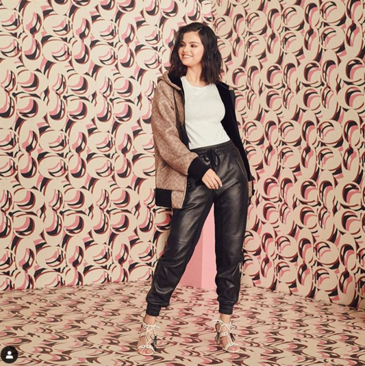 Первые кадры из этой рекламной кампании Гомес были опубликованы как в Instagram самой звезды, так и в официальном аккаунте бренда. На этих фото Селена, одетая в белую футболку, кожаные брюки и олимпийку oversize, выглядит очень жизнерадостной и счастливой. Модные образы певицы для фотосессии были дополнены изящными белыми босоножками и разными сумками из новой коллекции бренда.