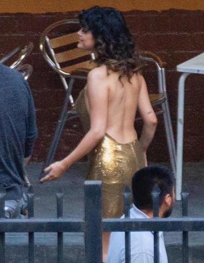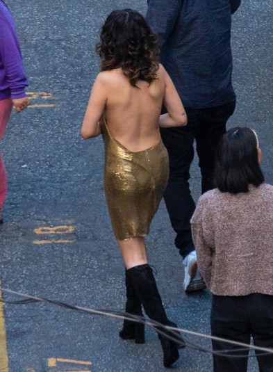 Артистка примерила мини-платье модного сейчас золотого цвета с обнаженной спиной. Под него звезда не стала надевать белье. Селена сделала волнистую укладку и яркий макияж. Свой образ Гомес дополнила черными ботфортами на высоком каблуке. По словам очевидцев, певица была в хорошем настроении - она с удовольствием общалась и фотографировалась с поклонниками в перерыве между дублями.