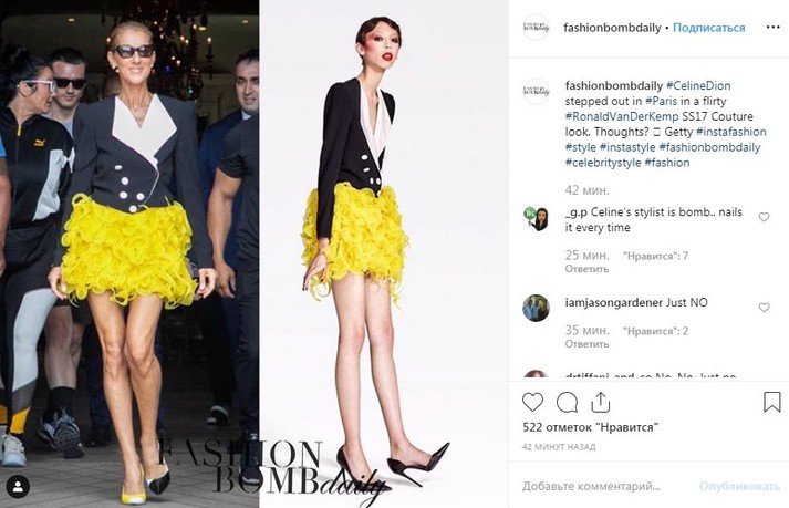 Для вечерней воскресной прогулки Дион выбрала миниатюрную юбку канареечного цвета со множеством оборок. Ее она объединила с достаточно андрогинным верхом - пиджаком с белыми лацканами. А завершила образ остроносыми туфлями на высоком каблуке. Примечательно, что они были разных цветов: один - под тон низа, другой - в цвет верха. В таком эффектном наряде она охотно позировала папарации, караулившим ее около отеля.