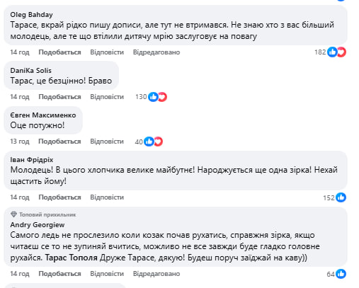 - «Велика подяка Тарасу Тополі за здійснення дитячої мрії. Хлопець молодець, талановитий».